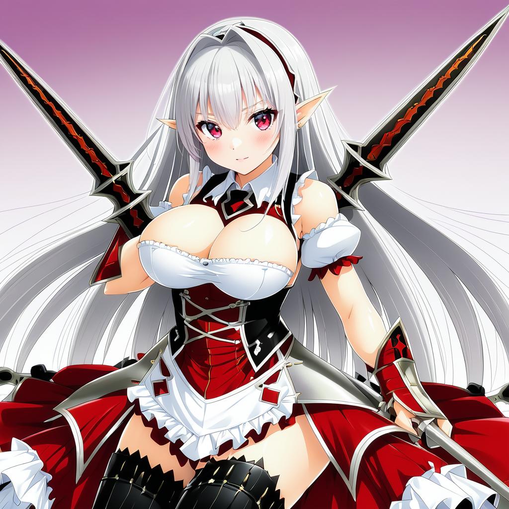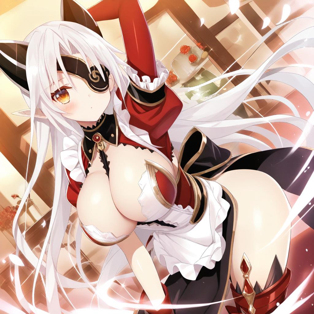 Aldra (queen's blade), queen's blade, 1girl, pointy ears, red eyes, eyepatch, long hair, silver hair, large breasts, apron, thighhighs, by artist naoki (2rzmcaizerails6), animagine