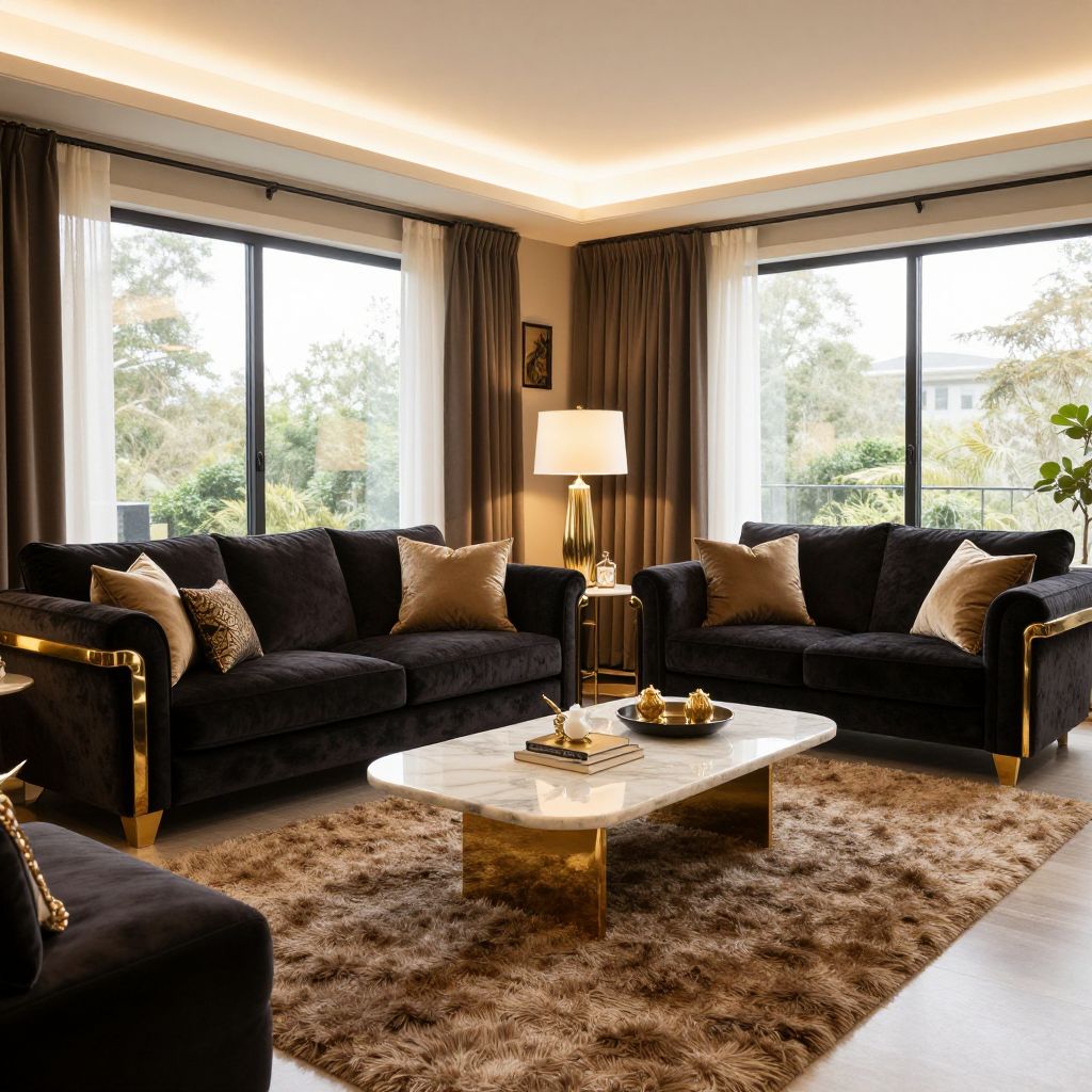 Black brown and gold living room with a modern luxurious design, velvet sofas, gold accents on furniture and decor, ambient warm lighting, large windows bringing in natural light, marble coffee table, plush area rug, elegant and cozy atmosphere.