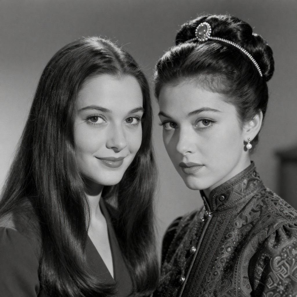 Black-and-white photograph of two women with dramatic, vintage hairstyles. The left woman has long, sleek hair and a subtle smile, while the right woman has an elaborate updo adorned with a jeweled headpiece and intense gaze. Both wear ornate, high-collared clothing. The background is blurred, emphasizing their faces and hairstyles.