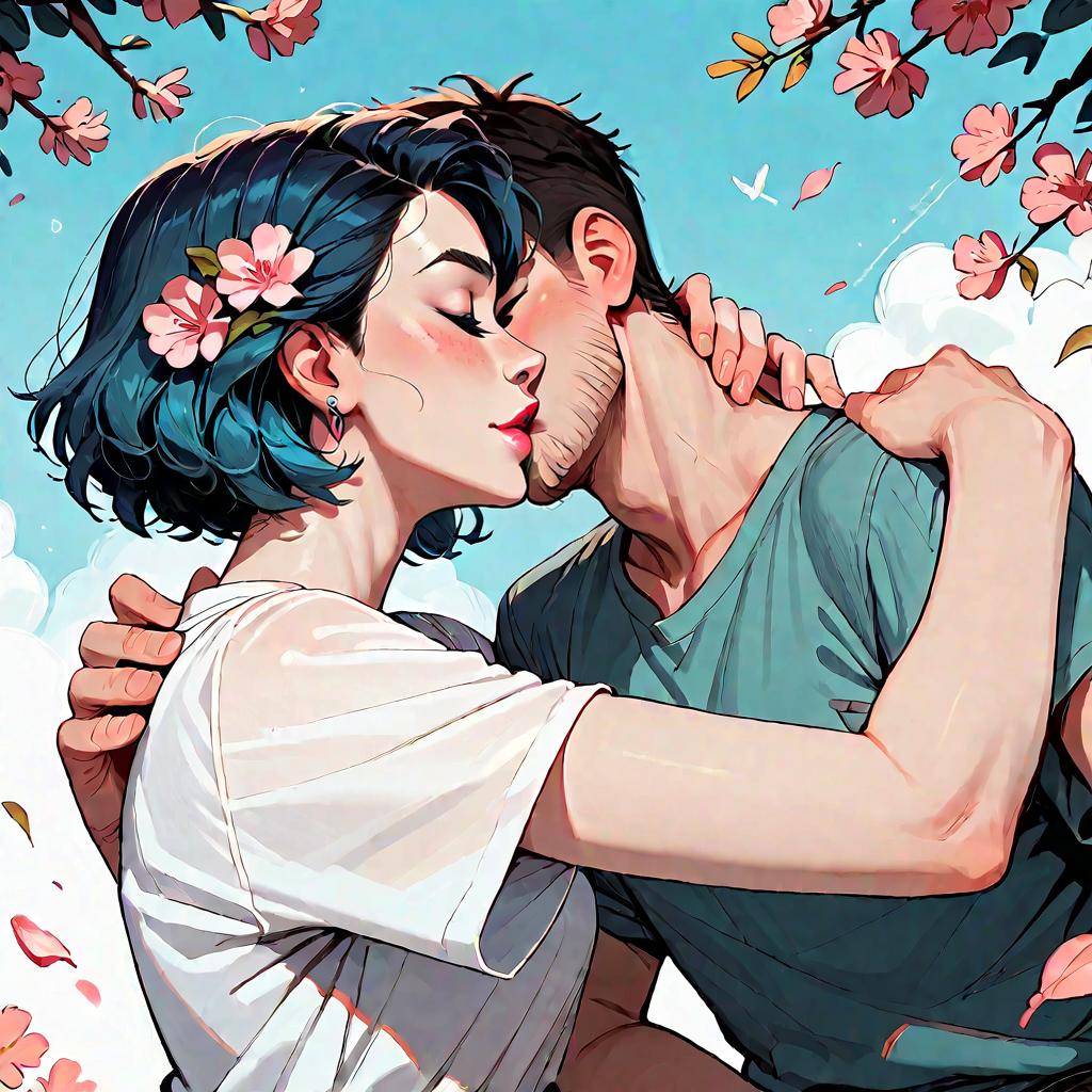 Digital illustration of a couple embracing closely under a bright blue sky with cherry blossom branches framing the scene. The woman, with short blue hair adorned with pink flowers, wears a white t-shirt. The man has short dark hair and wears a teal t-shirt. Both have light skin and are portrayed in a tender, intimate moment. The art style features vibrant colors and smooth shading.