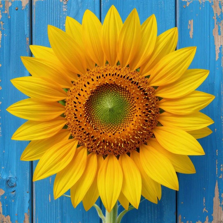 Vibrant sunflower with golden petals and a detailed green eye-like center stands out against a weathered blue wooden background, showcasing a bold and artistic floral print.