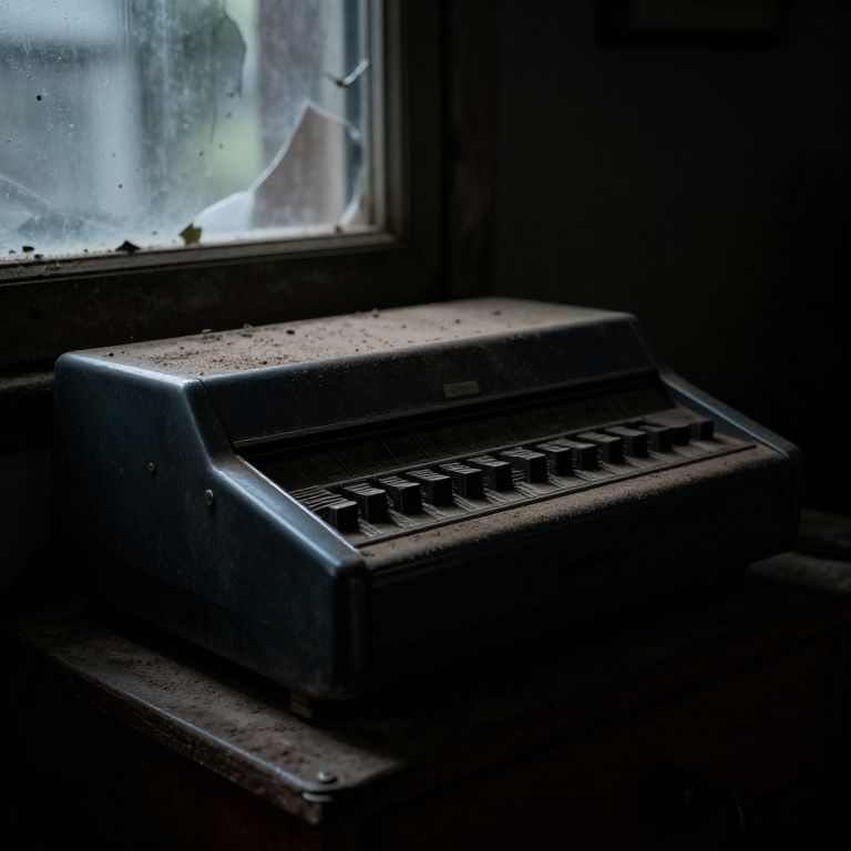 Registradora clásica cubierta de polvo en una tienda abandonada, luz tenue entrando por ventanas rotas, ambiente melancólico y decadente, detalles realistas en textura y sombras profundas.