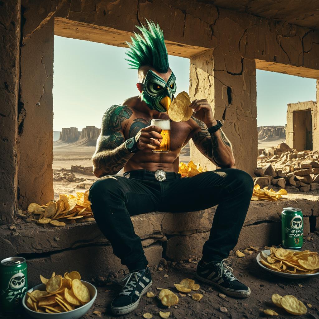 A muscular man with cybernetic arms and neon green hair and an anthropomorphic four-eyed owl in black pants, drinking beer and eating potato chips in an abandoned futuristic train station at twilight, cosmic liminal horror vibes, in the style of Peter Mohrbacher, Jason Edmiston, Anton Semenov, Zdzislaw Beksinski, Esao Andrews, hyper-detailed 8K.