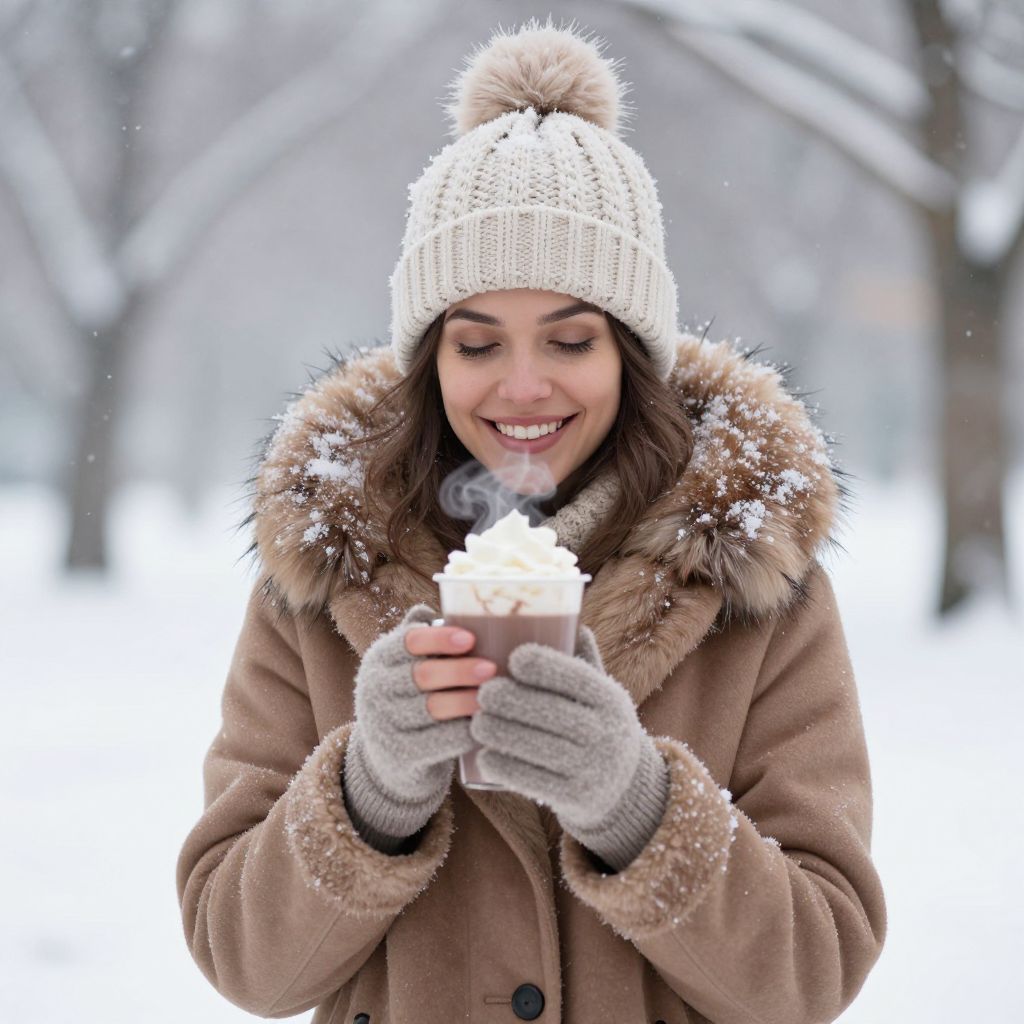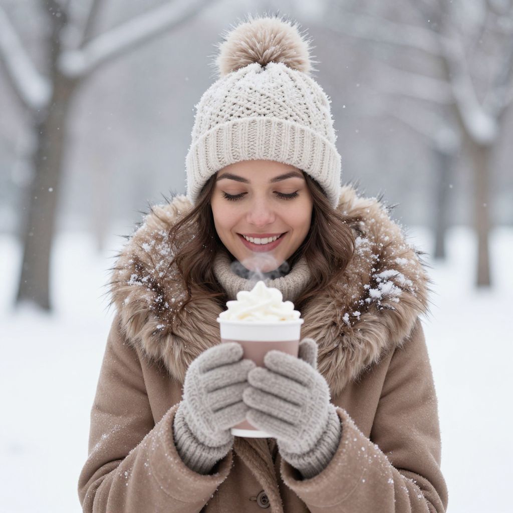 Smiling woman bundled in winter attire, including a beige knit hat with a fluffy pom-pom, a fur-lined brown coat, and fingerless gloves, holds a steaming cup of cocoa topped with whipped cream while standing amidst falling snowflakes in a serene snowy park.