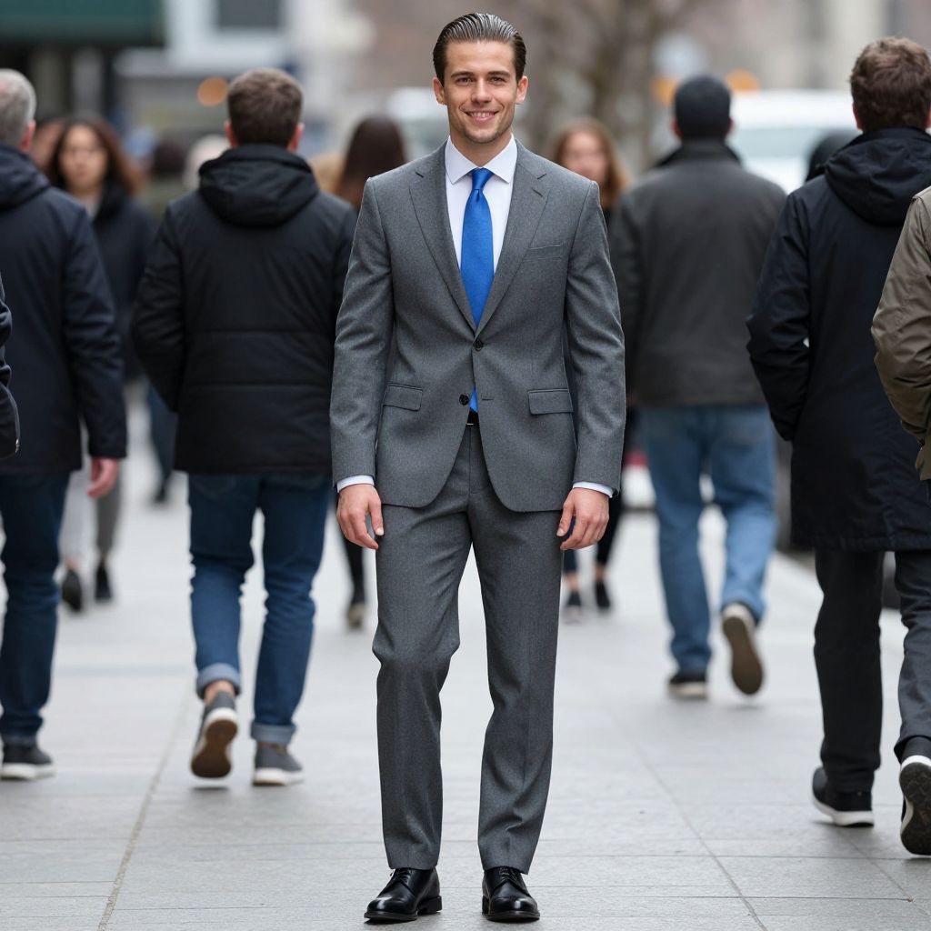 A handsome man in his late 20s, with neatly slicked-back brown hair and a confident smile, wearing a tailored grey suit, crisp white shirt, and a vibrant blue tie, paired with polished black shoes. He is standing on a bustling city sidewalk, with various people in the background adding depth and life to the scene.