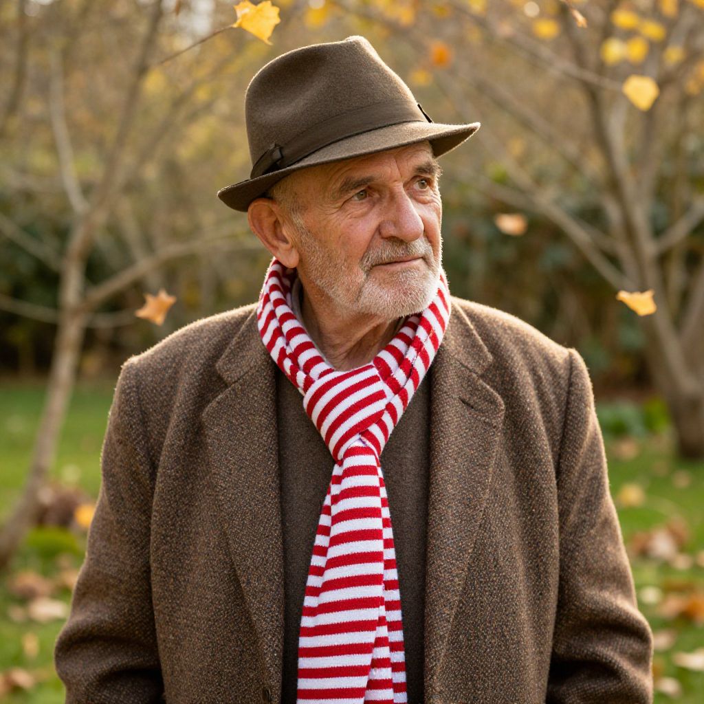 An old man with a white beard and a kind, weathered face, wearing a brown woolen jacket with a subtle pattern, a brown fedora hat tilted slightly to one side, and a vibrant red and white striped scarf neatly wrapped around his neck. He stands in a sun-dappled garden during early autumn, with golden leaves gently falling around him, a quiet, thoughtful expression on his face, as if recalling a peaceful memory.