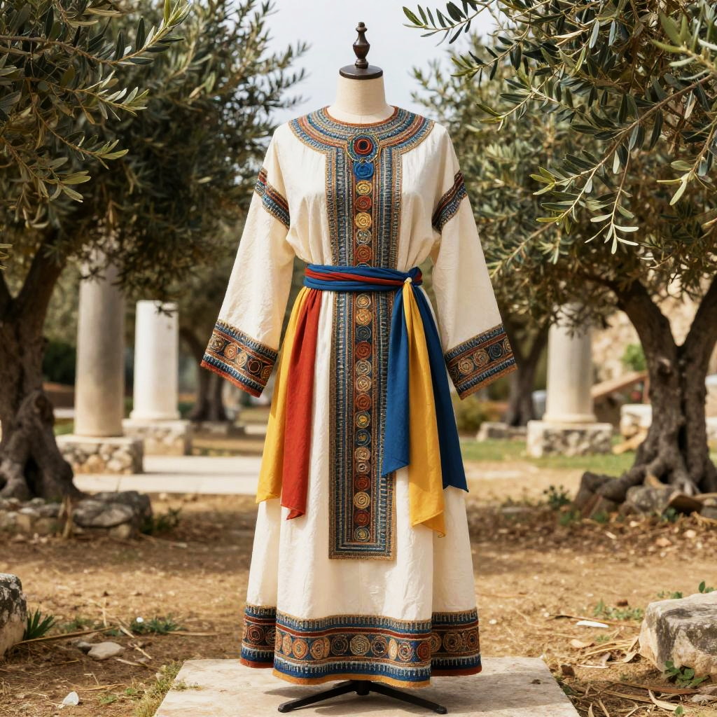Minoan clothing elaborate ceremonial costume, rich embroidery, layered skirts, colorful sashes, bronze age style, surrounded by olive trees and stone columns