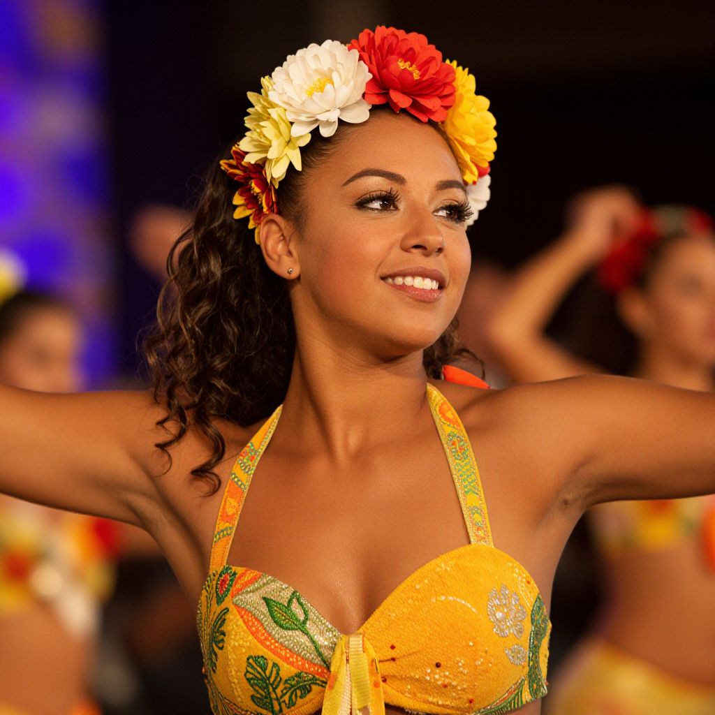 Waka Waka Dance Costume, a close up of a woman in a costume with a flower headdress
