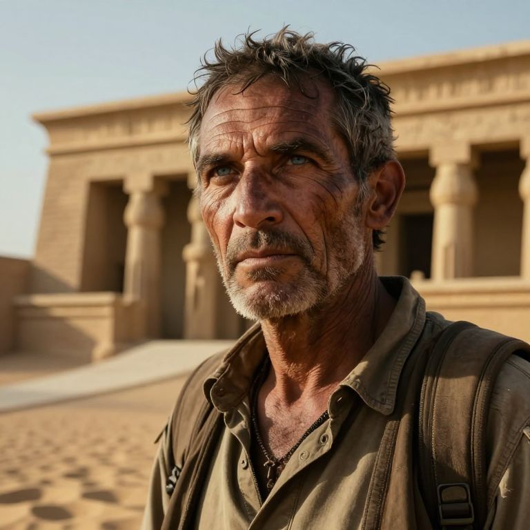 Craft an ultrarealistic portrait of a world-weary adventurer against the backdrop of an ancient desert temple. Focus on capturing their battered face, lined by years under the relentless sun's glare, and their hazy blue eyes that conceal untold journeys' secrets. Employ a dramatic low-angle perspective to emphasize their commanding presence as if viewed from the golden sands below. The fading daylight should illuminate soft shadows dancing across their rugged features, conveying both resilience and weariness. This emotional gradient reflects the spectrum of experiences that have shaped this formidable individual.