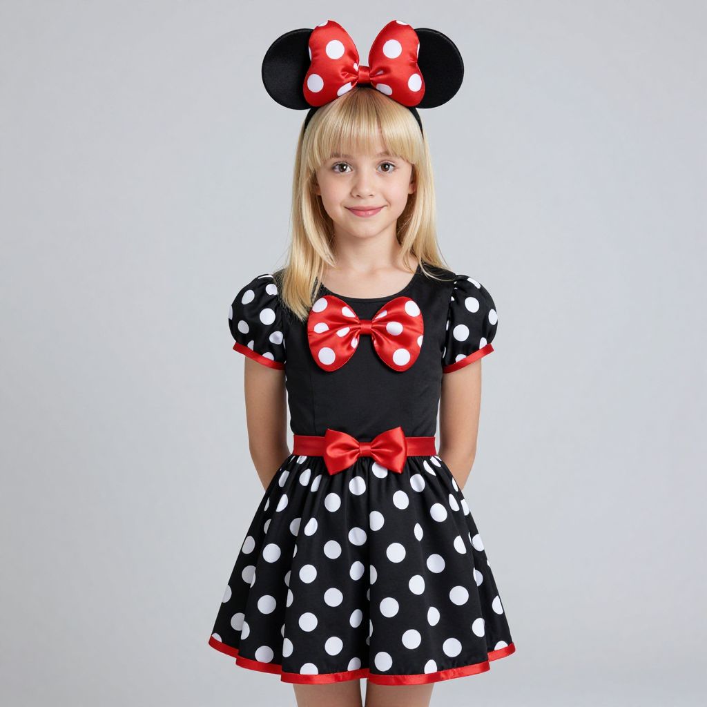 Photograph of a young blonde girl with straight hair and bangs, wearing a black dress with white polka dots, red trim, and red bow accents. She has black Minnie Mouse ears with a large red polka-dotted bow on top. The dress has short sleeves and a flared skirt. She stands against a plain white background, smiling softly at the camera. The overall style is reminiscent of classic Disney character costumes. The girl's fair skin contrasts with the dark and bright colors of her outfit.