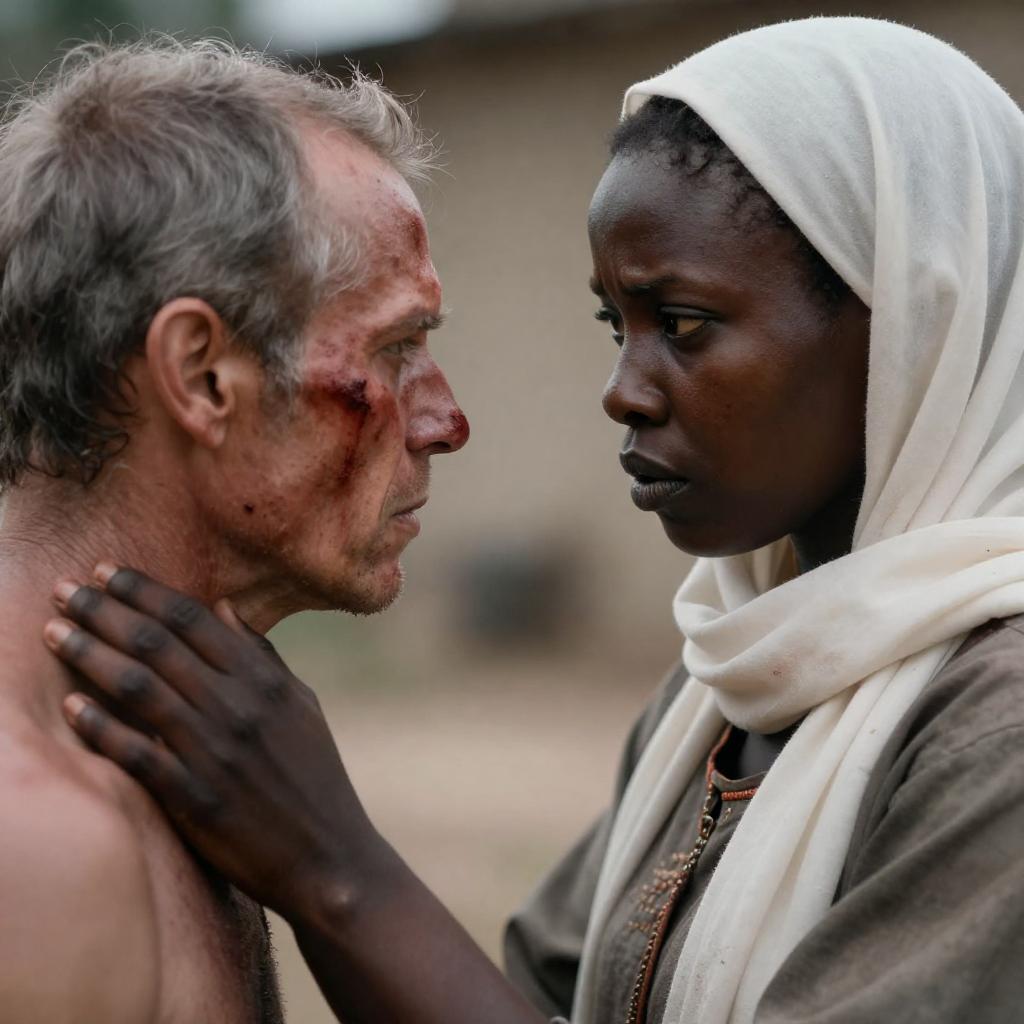 Photograph of a close-up scene showing a Black woman with dark skin and a white headscarf, intently looking at a dirty, blood-streaked white man with gray hair. They are facing each other, with a blurred background. The woman's expression is serious, while the man's face shows wear and distress.