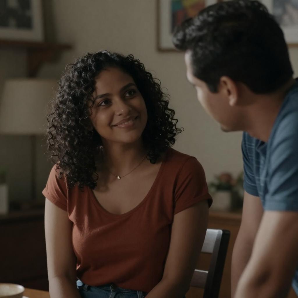 Photograph of a dimly lit room with a woman and a man. The woman, with curly black hair and medium brown skin, wears a rust-colored, short-sleeved top and smiles warmly. The man, with short dark hair and a blue striped shirt, leans forward, partially out of frame. Background includes a lamp, shelves, and framed pictures.