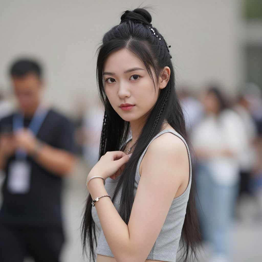 Photograph of an Asian woman with long black hair in a bun, wearing a gray crop top, standing outdoors, blurred background, people around.