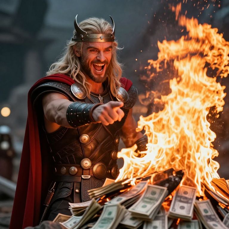 Prime Lens Greek god Odin burning a pile of money, 16:5, v 5, hyper realistic, cinematic, laughing and pointing, fire,