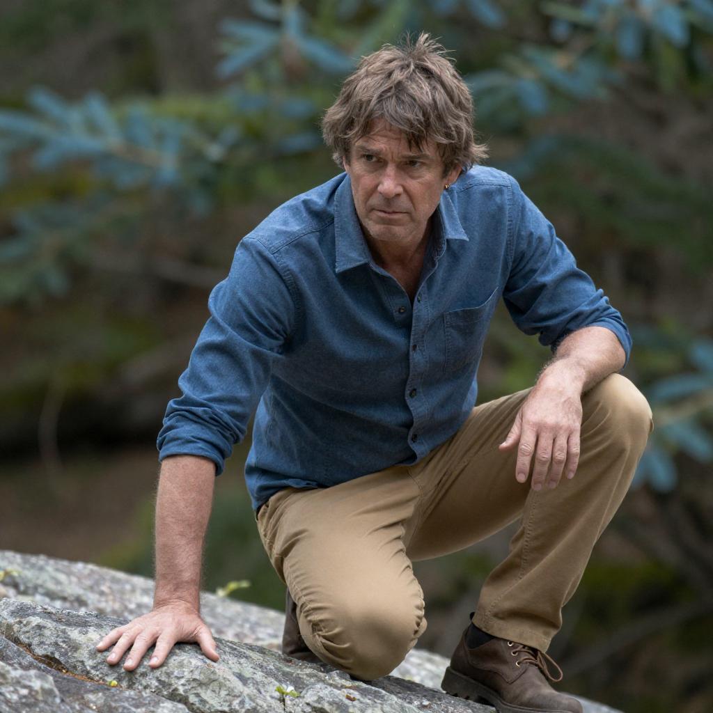 Middle-aged man with light brown hair, wearing beige shirt and brown pants, standing in dense forest. Tall trees surround him, sunlight filtering through leaves. He looks determined, slightly tense. Forest floor covered in greenery. Light brown belt with pouches.