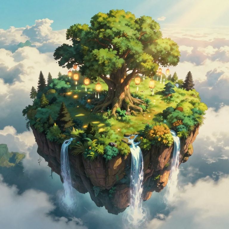 Digital art of a floating island with a lush, green tree, waterfalls, glowing lanterns, and surrounded by fluffy clouds.