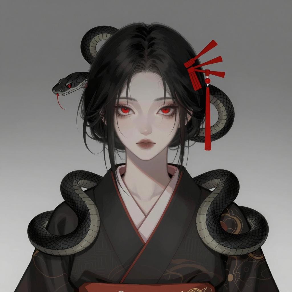 Digital illustration of a pale-skinned woman with red eyes, black hair, and red hair ornaments. Multiple black snakes coil around her head and shoulders. She wears a dark, patterned kimono. Her expression is calm. Grey gradient background.