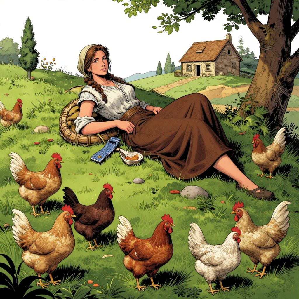 A hyper-detailed, comic book-style illustration of a peasant woman lounging atop a grassy hill surrounded by chickens, with a small cottage in the distance and intricate details throughout.
