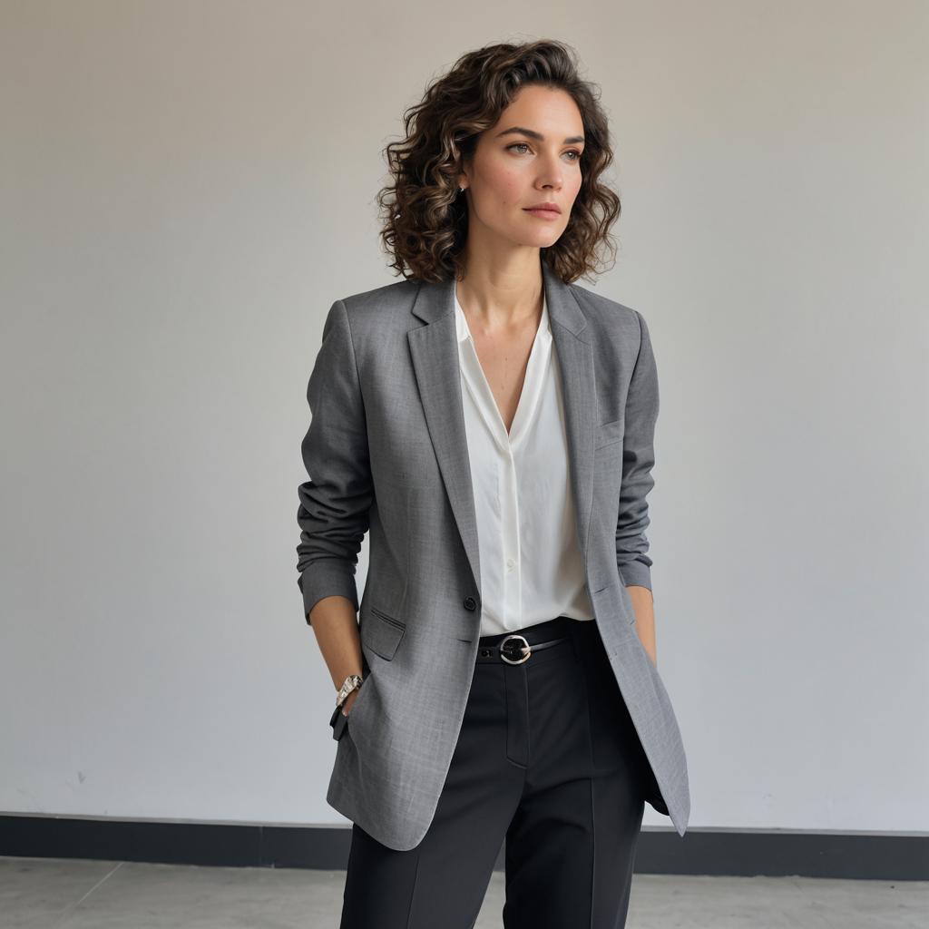 Portrait of a confident woman with cascading curls wearing a tailored graphite gray blazer over a white cotton blouse and black slim-fit trousers. She accessorizes with a minimalist watch and poses against a neutral, minimalist background, exuding modern understated elegance.