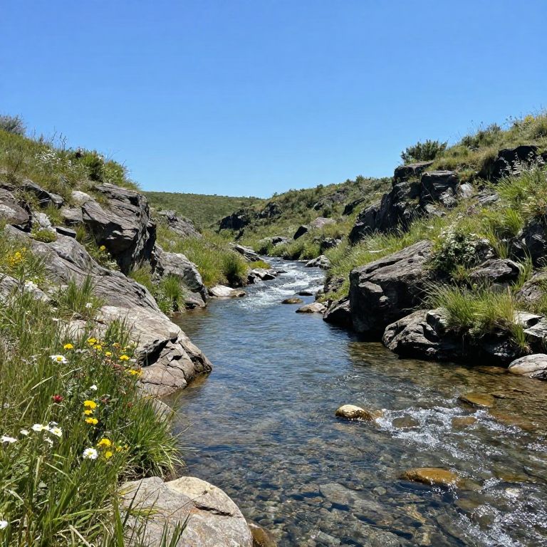 Riachuelo winding gently between rocky banks, wildflowers blooming along the edges, clear blue sky above, sparkling clear water with smooth stones visible underneath, tranquil scene capturing the essence of untouched nature, photorealistic style.