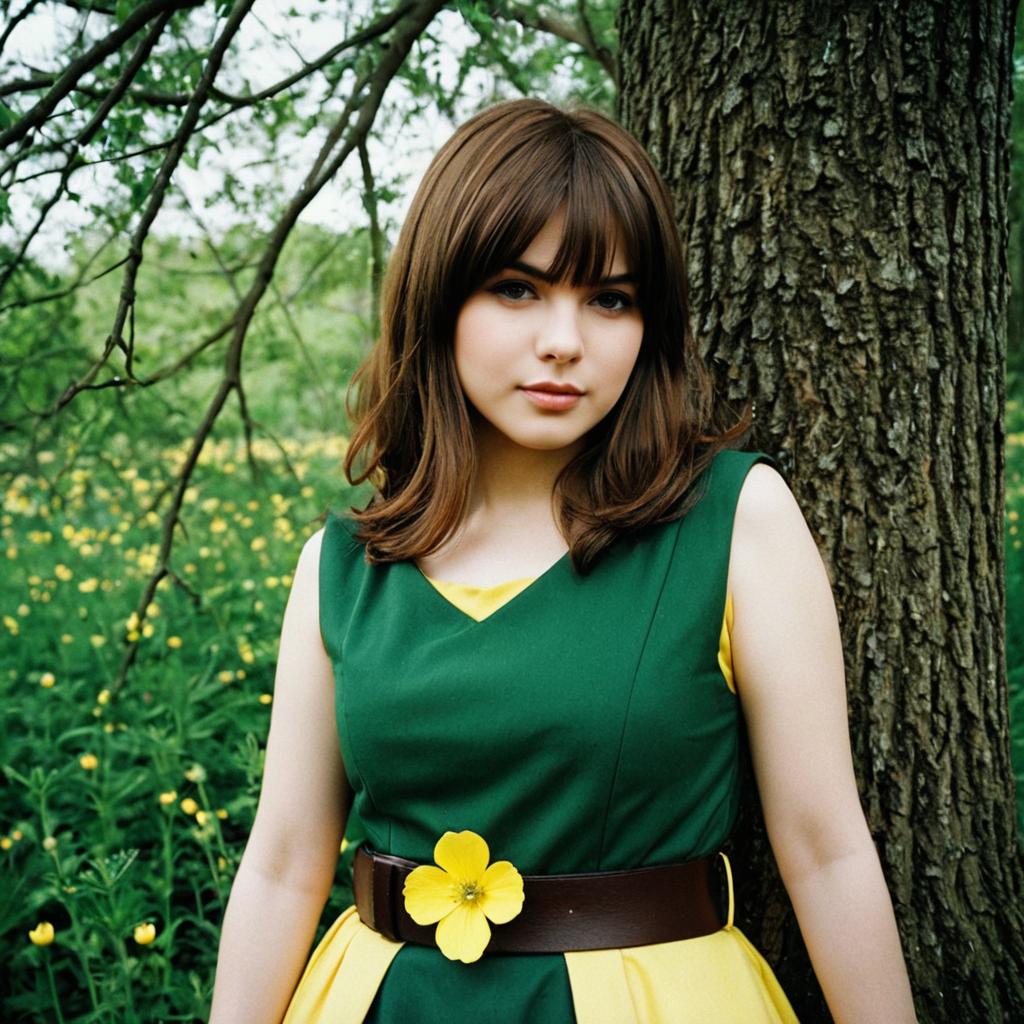 Dipper costume ,1girl, solo, realistic, brown hair, long hair, dress, outdoors, photorealistic, looking at viewer, short sleeves, nature, standing