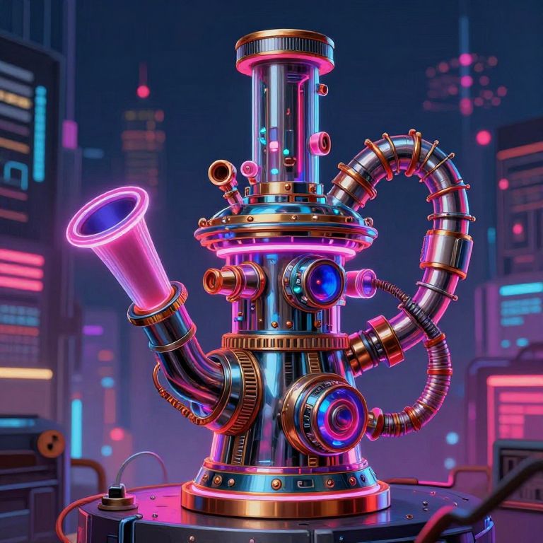 Crazy looking bongs that resemble futuristic machines with complex pipes and glowing tubes, infused with neon lights and reflective surfaces, set in a cyberpunk cityscape background, ultra detailed and vibrant digital painting.