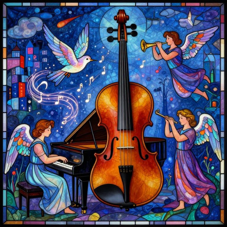 Piano stained glass panel depicting a serene concert scene, colorful abstract patterns surrounding the piano, shimmering light effects, modern artistic style, intricate details