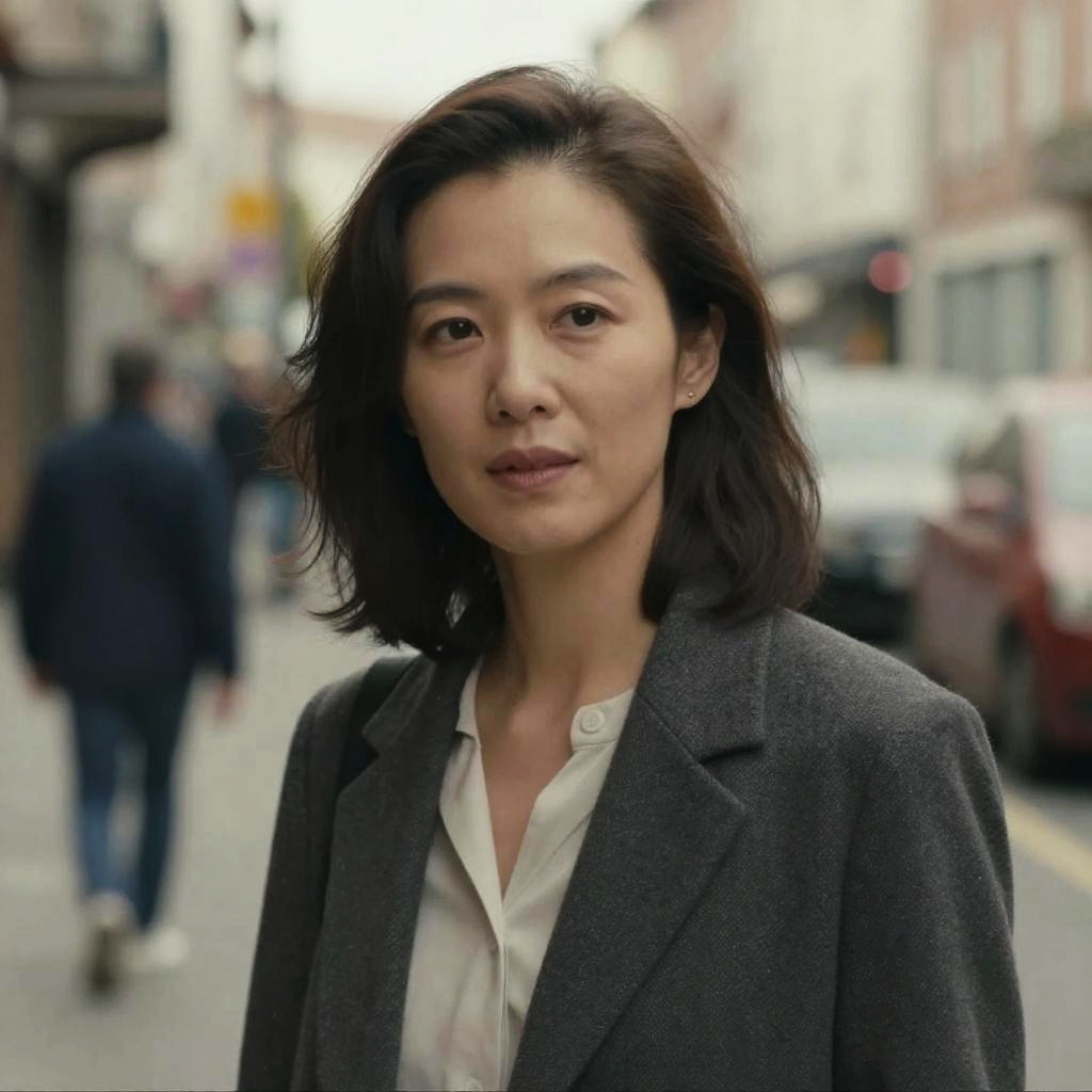 Photograph of an Asian woman with straight black hair, wearing a dark navy coat and bright blue scarf, standing on a blurred city street with parked cars
