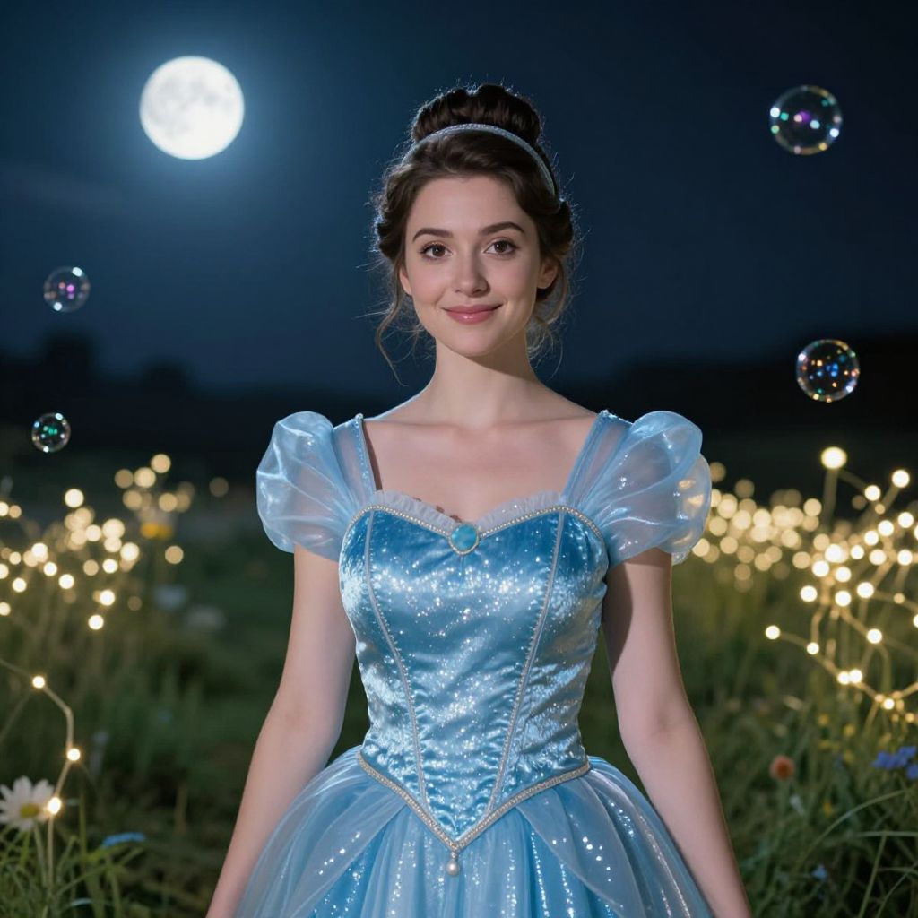 A cinematic wide shot of a woman in a Princess Aurora blue costume standing in a moonlit fairytale meadow, the blue dress shimmering under nightlight, her face soft and smiling with warm brown eyes and natural features, surrounded by fairy lights and floating bubbles.. The woman has big tits and cute face