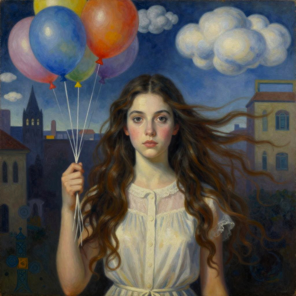 Realistic photo.Portrait in the style of Salvador Dalí and Marc Chagall, of a young lady with flowing hair resembling a city filled with clouds and balloons. Double exposure, naive art, extremely detailed, optical illusion effect, oil painting style realistic photo