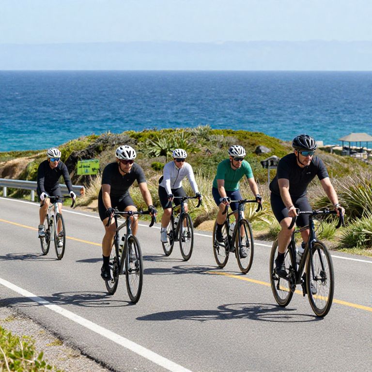 A group of people riding bicycles on a scenic coastal road, with the ocean in the background, highlighting the role of bicycles in travel transportation