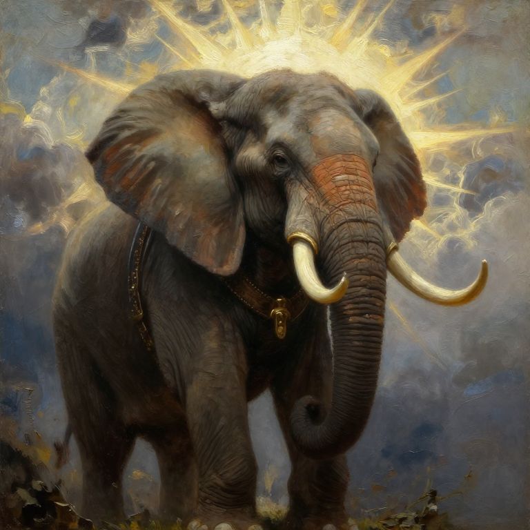 This digital artwork depicts a majestic elephant with a glowing, radiant halo behind its head. The elephant has large, curved ivory tusks and is adorned with a gold chain around its neck. Its gray, textured skin is detailed with fine lines, and its large ears are spread out. The background is a dramatic mix of dark clouds and bright, golden light rays emanating from the halo, creating a celestial effect. The overall style blends realism with a mystical, almost religious theme, emphasizing the elephant's grandeur and spiritual significance.