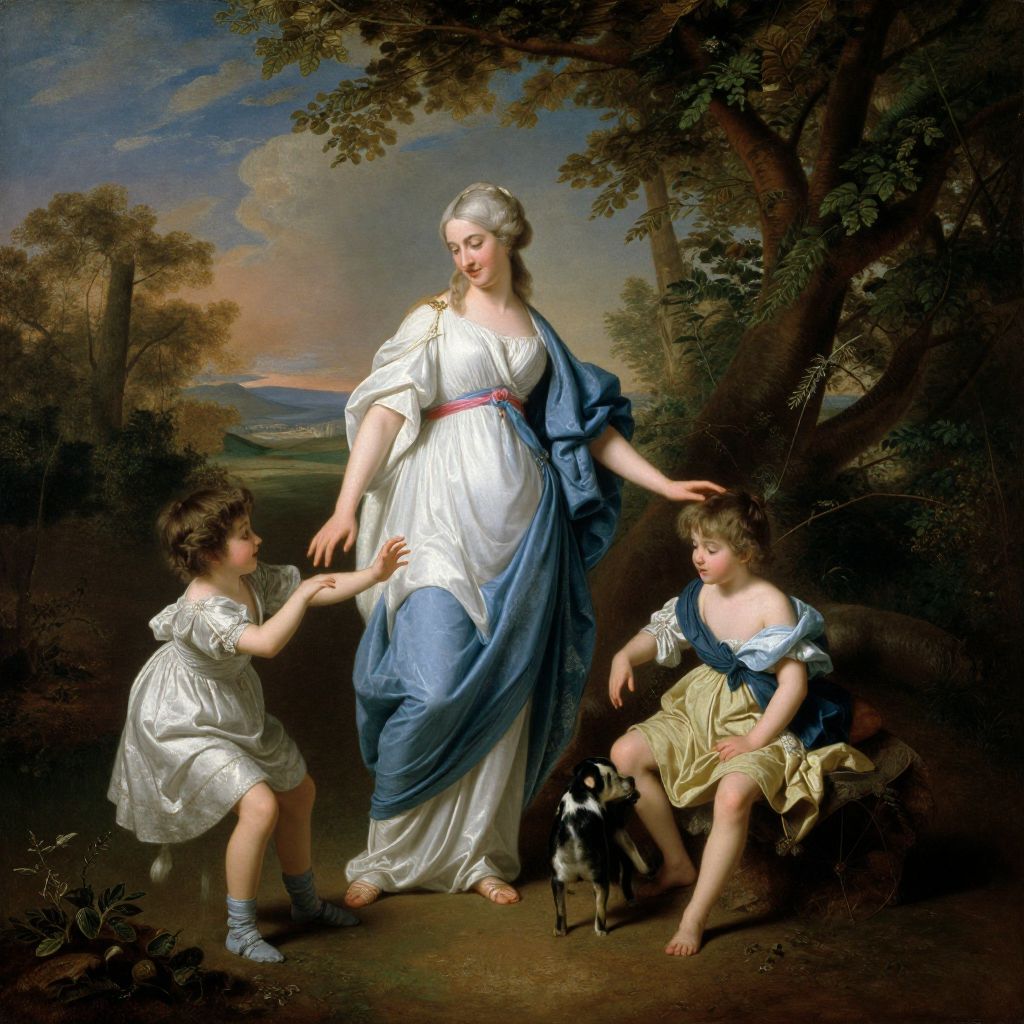 A classical oil painting by François Boucher, showcasing a serene pastoral scene where a woman in flowing white and blue robes tenderly interacts with two children, one playfully reaching out while the other sits beside a small dog, all set against a lush, detailed landscape with dramatic lighting and high-definition detail.
