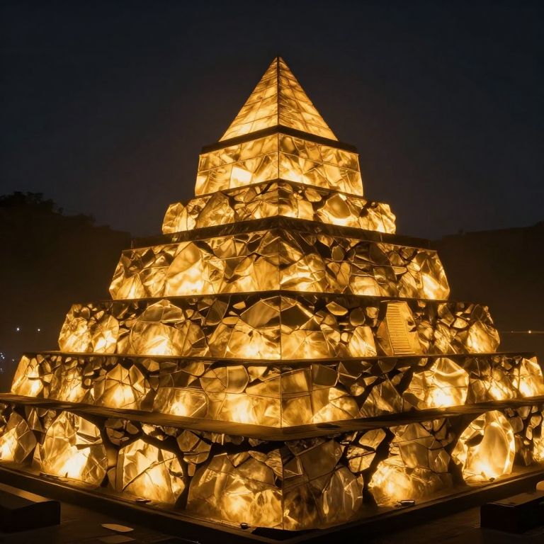 Glowing tiers of luminescent stone ascend in a majestic, multi-level pyramid, illuminated by golden light emanating from its edges, casting an ethereal glow against the dark, misty backdrop.