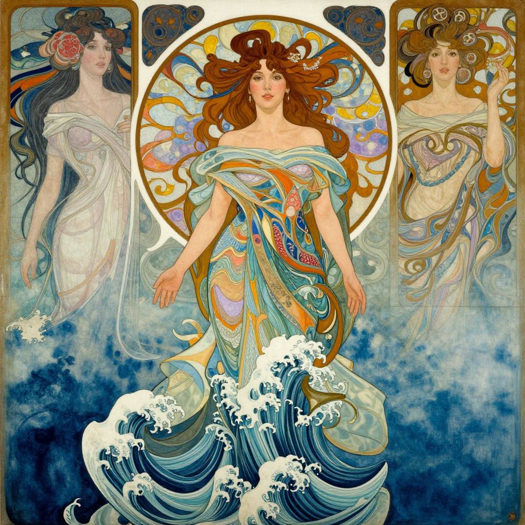 This digital illustration features a central, ethereal, fair-skinned woman with flowing auburn hair, wearing a colorful, off-shoulder, fish-scale-patterned dress, surrounded by waves. She is encircled by a radiant, sun-like halo with swirling, multicolored patterns. Flanking her are two other women, one with dark hair and a red flower, and the other with brown hair, both in white, flowing, classical-style dresses. The background is a mix of deep blue and white waves, creating a mystical oceanic scene. The style is reminiscent of Art Nouveau with its flowing lines and intricate patterns.