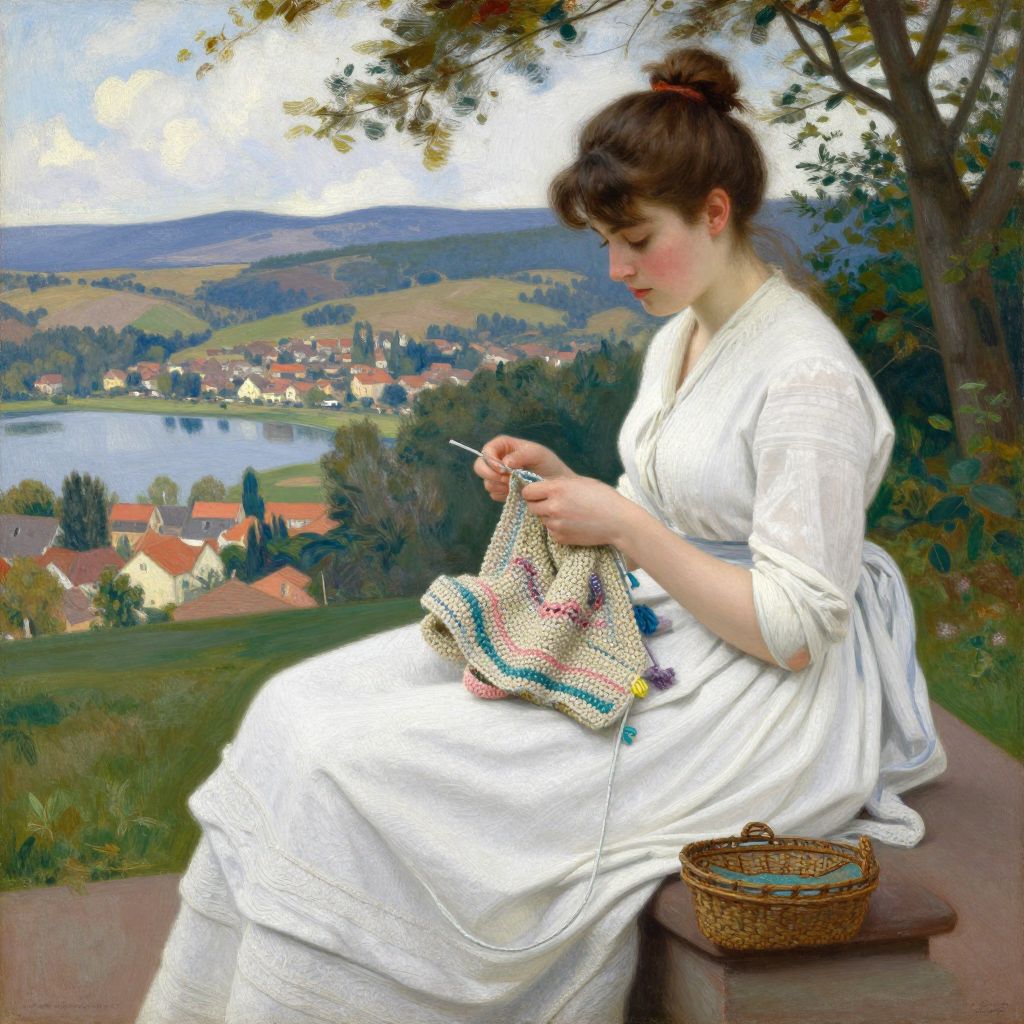 Painting of a fair-skinned woman with brown hair in a bun, wearing a white dress, knitting near a scenic hillside village.