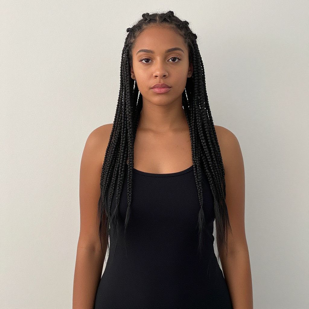 Photograph of a young Black woman standing against a plain white background. She has long, straight, black braids that fall past her shoulders, with small hair beads at the crown. She wears a simple, black, sleeveless tank top that contrasts with her dark brown skin. Her expression is neutral, with slightly parted lips and a direct gaze at the camera. Her eyebrows are natural and well-groomed. The lighting is even, highlighting her clear, smooth skin and the texture of her braids. The overall composition is minimalistic, focusing on her face and hairstyle.