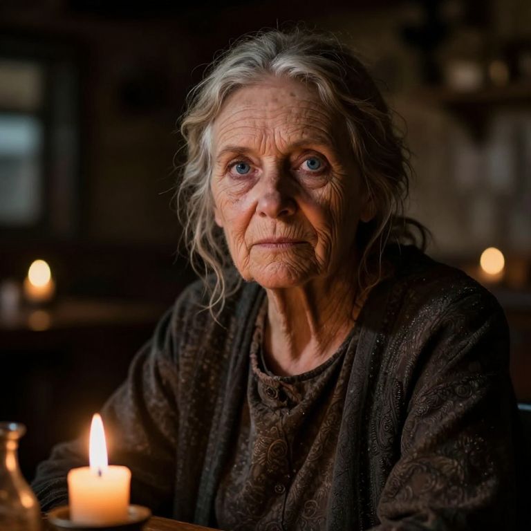 Photograph of an elderly woman with long, wavy, gray hair and deep blue eyes, wearing a dark, textured, patterned robe. She has a wrinkled face with prominent cheekbones and a solemn expression. The background is dimly lit with a warm, amber glow from several candles, creating soft shadows. The candles are scattered around her, with one prominently in the foreground. The overall ambiance is dark and intimate, highlighting the woman's aged features and the soft candlelight. The focus is sharp on her face, with a slightly blurred background.