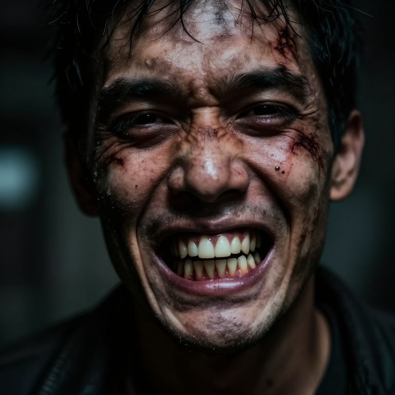 Character with messed up teeth, gritty urban setting, expressive face covered in scars and crooked teeth, detailed texture, dynamic lighting, dark color palette, gritty realism, close-up portrait with intense emotion, atmospheric background