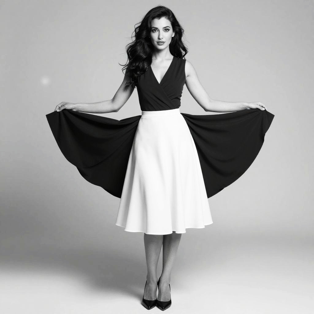 Black-and-white photograph of a stylish woman with wavy hair, wearing a sleeveless, V-neck black top paired with a bright white, knee-length, layered skirt. She's standing with her arms out, spreading the black fabric of her top. She's wearing black heels, and the background is a soft gradient with subtle light flares. Her expression is confident and poised.