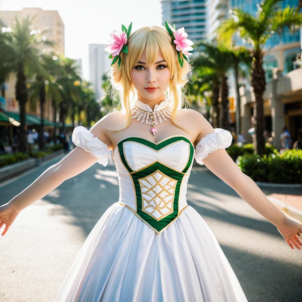 Most popular anime cosplay, photograph of a cute anime-style cosplayer, blonde hair, pink flower hairpins, white and green medieval-style dress, high collar, strapless, gold embroidery, white choker with pendant, standing on street, sunny, blurred background of buildings, palm trees, arms outstretched, holding dress skirt, soft sunlight, light skin, serious expression, realistic, detailed costume, fantasy-inspired, daytime, urban setting, cosplay, anime influence