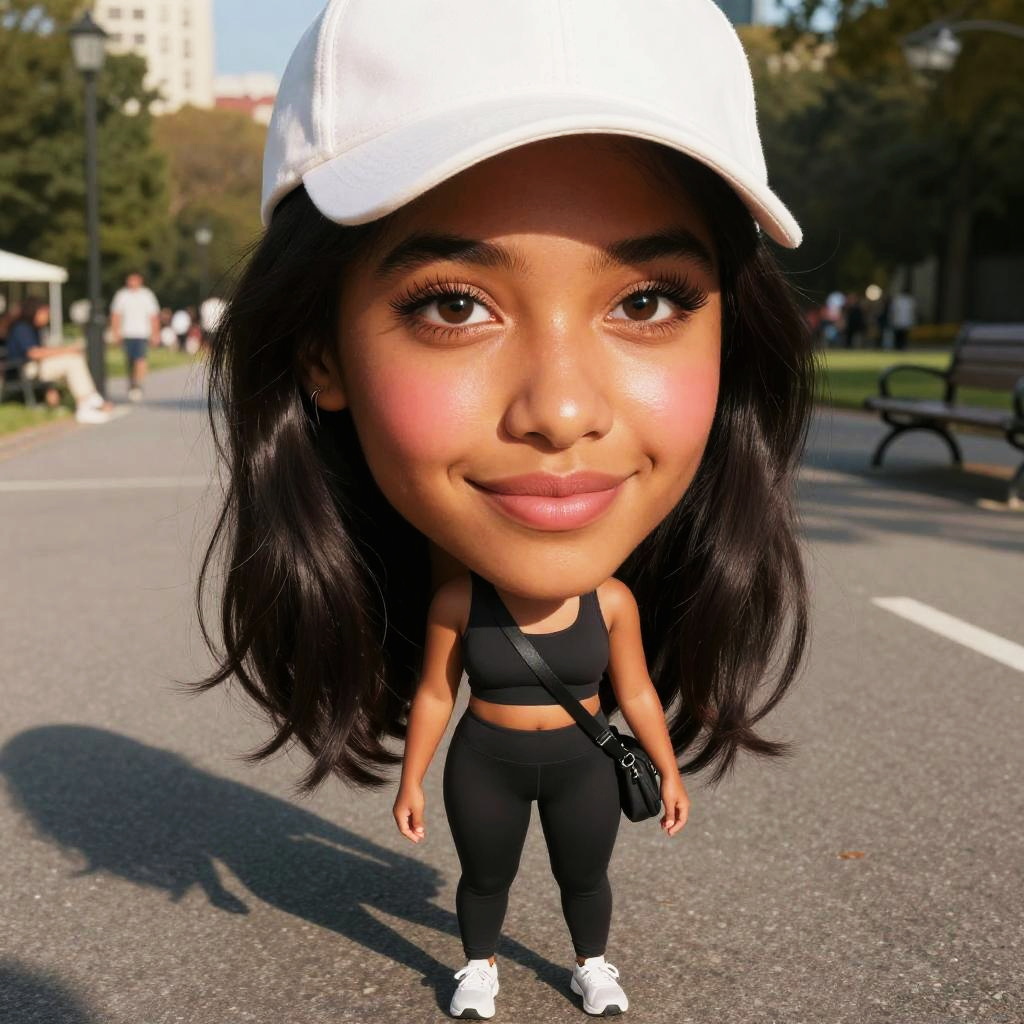 This is a digital CGI image of a hyper-realistic, cartoonish-style woman with an exaggerated large head and small body. She has medium brown skin, large brown eyes, and long, wavy black hair. She wears a white baseball cap, a black sports bra, black high-waisted leggings, and white sneakers. She carries a small black crossbody bag. The background shows a sunny park with trees, a bench, and blurred people walking. The asphalt path she stands on has a white line running through it. The lighting casts a sharp shadow of her head and hat to her left.