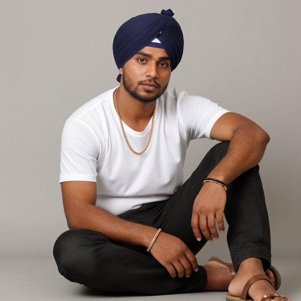 Photograph of a young South Asian man with a medium-brown complexion and short, dark beard, sitting cross-legged on a gray floor against a plain gray background. He wears a navy blue turban, a white short-sleeved t-shirt, black pants, and brown sandals. His accessories include a gold chain necklace, a gold bracelet on his right wrist, and a black bracelet on his left wrist. He has a focused, neutral expression and his right arm rests on his knee while his left arm is bent, supporting his weight. The image has a slightly realistic, digitally enhanced style.