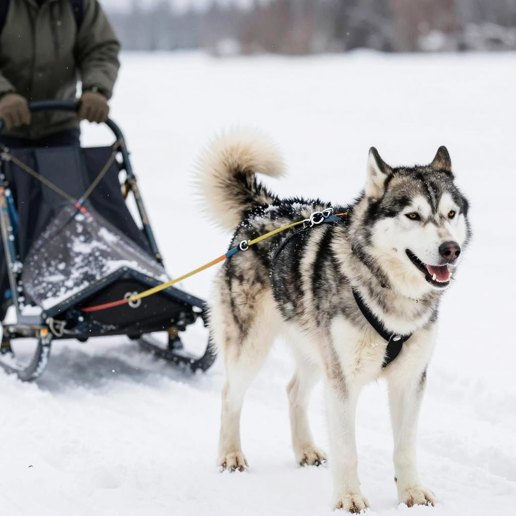 Gray Alaskan Malamute sled dog harnessed and ready, pulling sled through icy Arctic landscape, powerful build, fluffy fur textured with snowflakes, rugged winter atmosphere