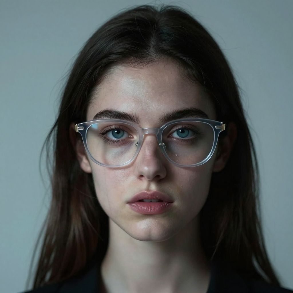 Photograph of a young woman with fair skin and light freckles, wearing large, round, gold-rimmed glasses with thin, brown tortoiseshell arms. She has shoulder-length, wavy brown hair and light blue eyes. Her expression is neutral with slightly parted, natural pink lips. She is wearing a light grey, collared shirt. The background is a plain, beige wall, adding a soft, subtle contrast to her features. The lighting is even, highlighting her clear complexion and the texture of her hair and glasses. The overall style is natural and minimalist.