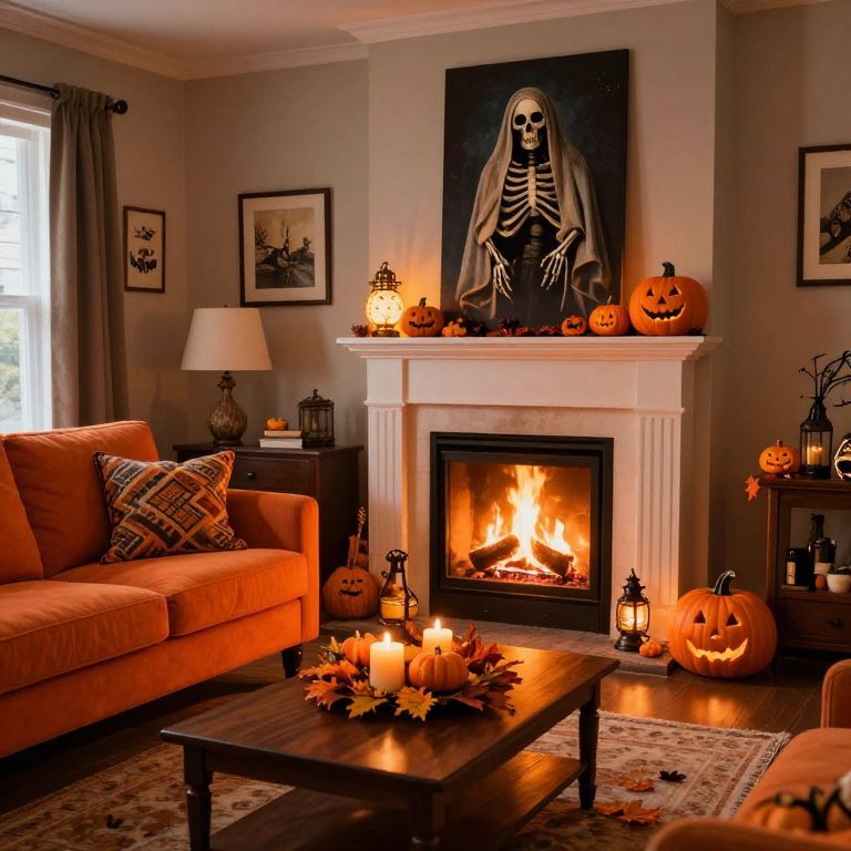 Cozy living room warmly illuminated by a crackling fireplace, featuring a vibrant orange sofa adorned with patterned cushions, a dark wooden coffee table hosting a seasonal centerpiece with candles and pumpkins, and a striking wall art above the mantel depicting a skeletal figure draped in a shroud, all complemented by Halloween-themed decorations including jack-o'-lanterns, glowing lamps, and autumnal accents.