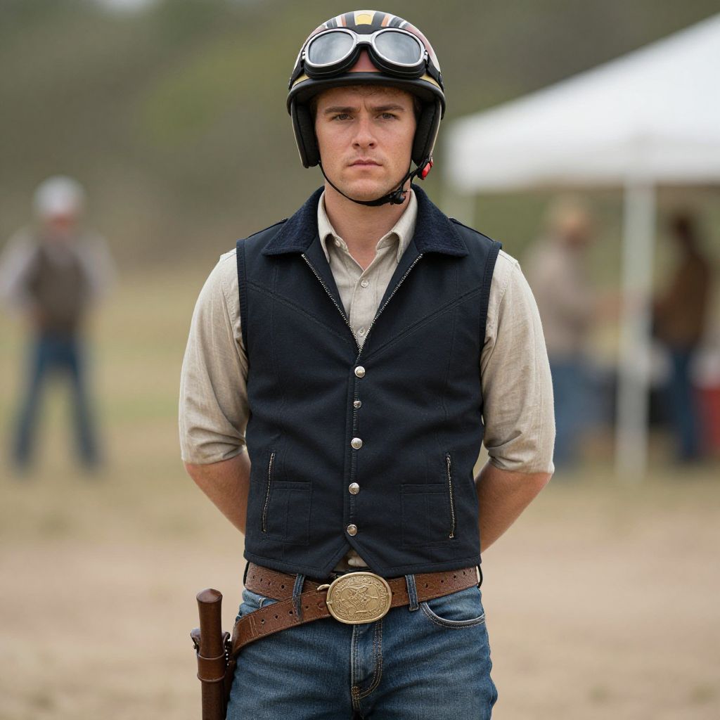 Viago costume, 1boy, male focus, helmet, belt, blurry background, realistic, looking at viewer, blurry, outdoors, solo, vest, jacket, cowboy shot, arms behind back