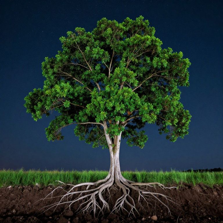 Solitary tree stands tall against a starry night sky, its vibrant green canopy reaching upward while intricate roots extend downward into rich, dark soil beneath a grassy horizon.