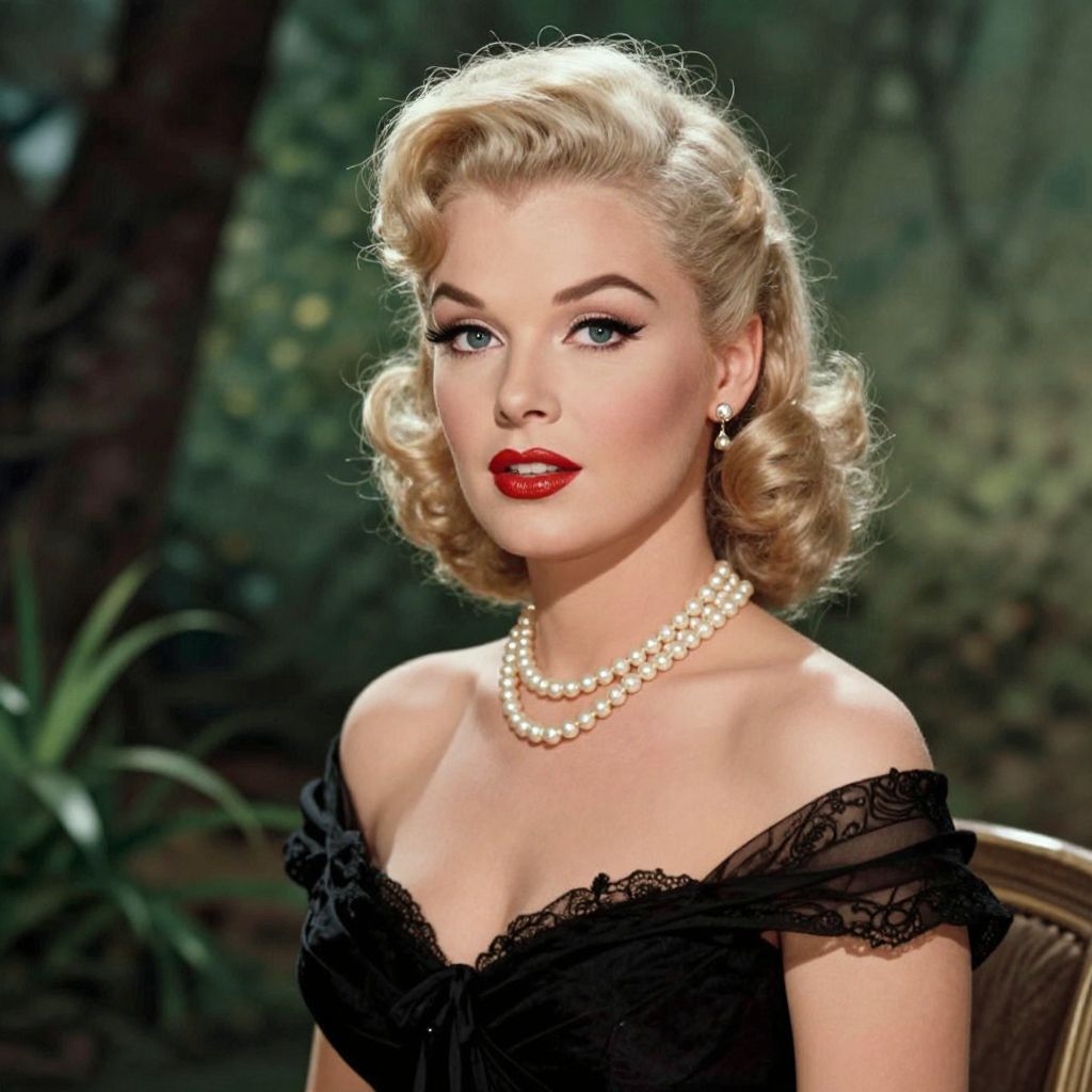 Photograph of a blonde, blue-eyed woman with red lipstick, wearing an off-shoulder black lace dress and pearl necklace, set against a green
