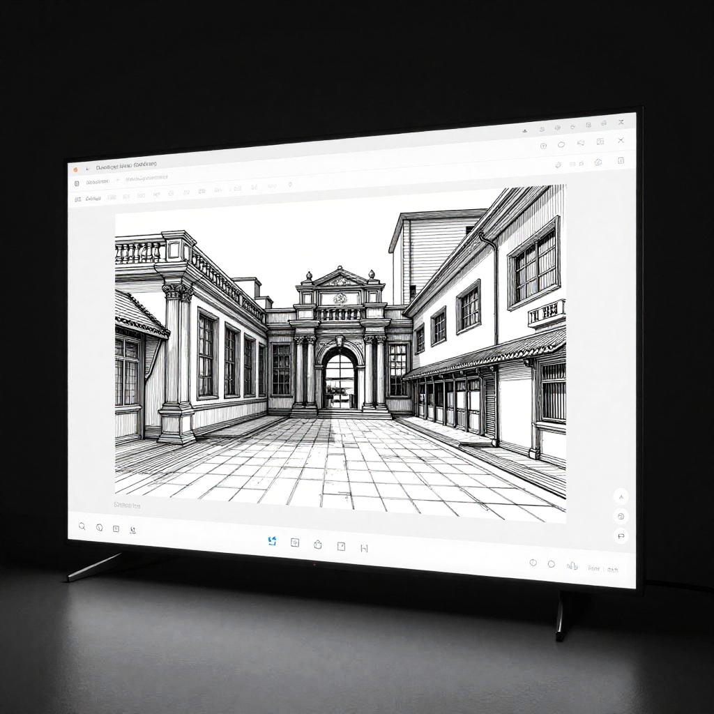 This is a black-and-white digital drawing in a detailed, line-art style depicting a European-style architectural courtyard. The image features a central arched entrance with ornate detailing, surrounded by tall, columned buildings on both sides. The courtyard is paved with large tiles, leading the viewer's eye to the arched entrance. The buildings have intricate window designs and small balconies. The drawing is mounted on a black wall, creating a stark contrast with the white background and black lines of the artwork. The overall style is reminiscent of architectural sketching.